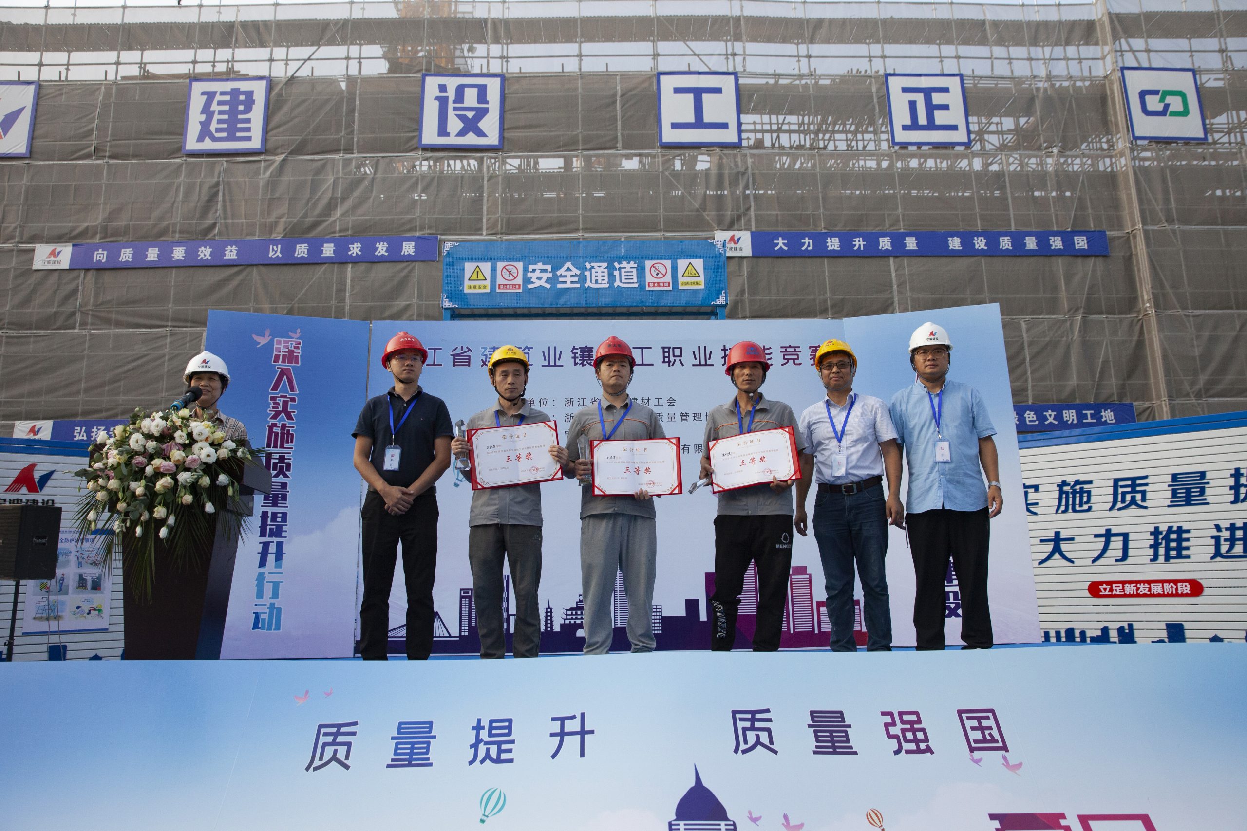 ? ? ?此外,當(dāng)天在新芝小學(xué)項(xiàng)目觀摩會(huì)現(xiàn)場(chǎng),還舉行了全省建筑業(yè)鑲貼工職業(yè)技能競(jìng)賽,共有11支鑲貼工競(jìng)賽隊(duì)伍同臺(tái)競(jìng)技,比拼瓷磚薄貼法工藝。比賽分為理論和實(shí)操兩塊,要求參賽者從施工規(guī)范、質(zhì)量要求、裝飾構(gòu)造以及對(duì)防水、防潮、防霉等處理辦法的掌握情況等方面,決出一、二、三等獎(jiǎng)。最后通過激烈角逐,省建投代表隊(duì)獲一等獎(jiǎng),寧波代表隊(duì)獲得二等獎(jiǎng)。我集團(tuán)公司董事長陳繼東為獲得一等獎(jiǎng)的選手頒獎(jiǎng)。